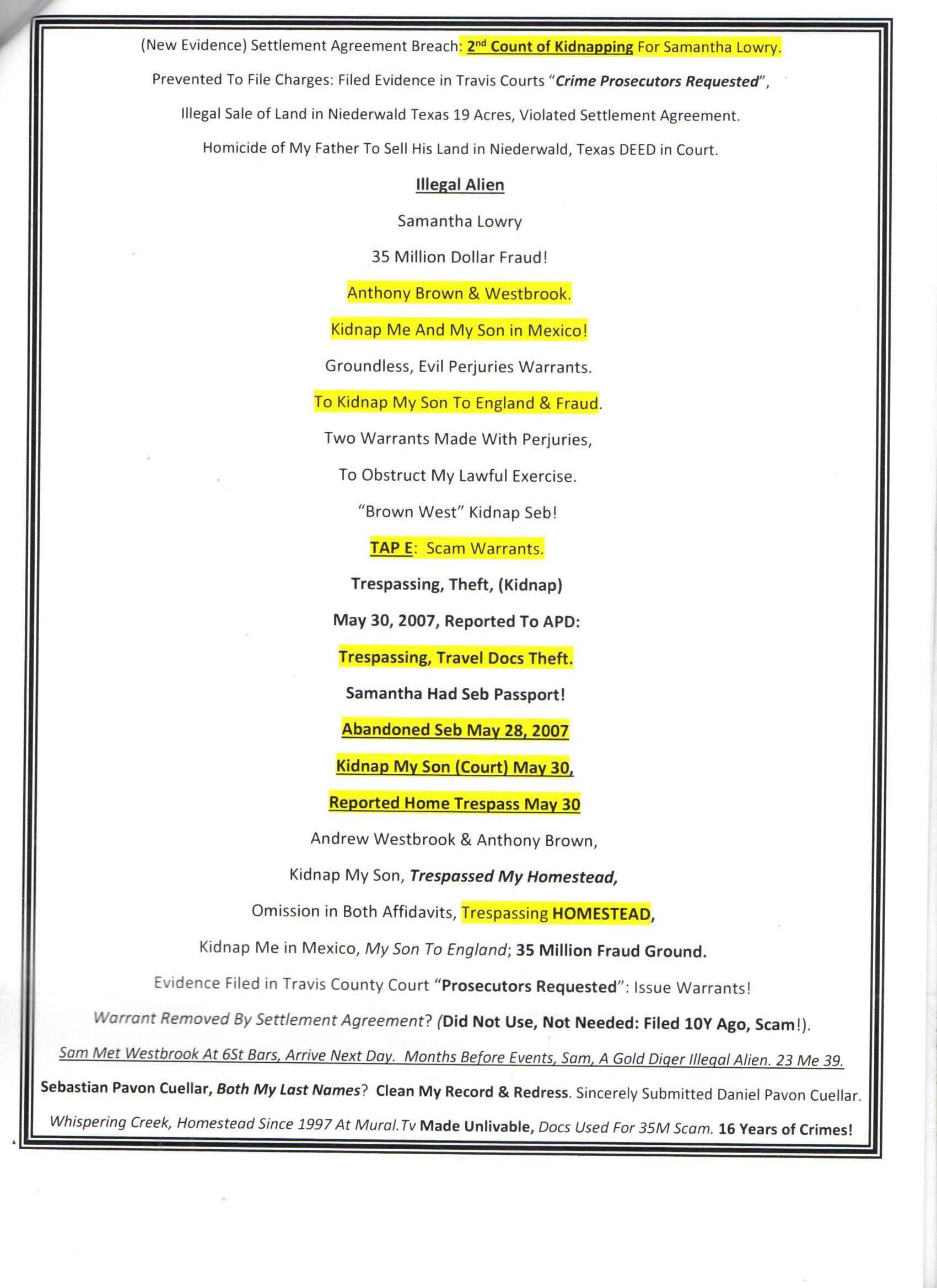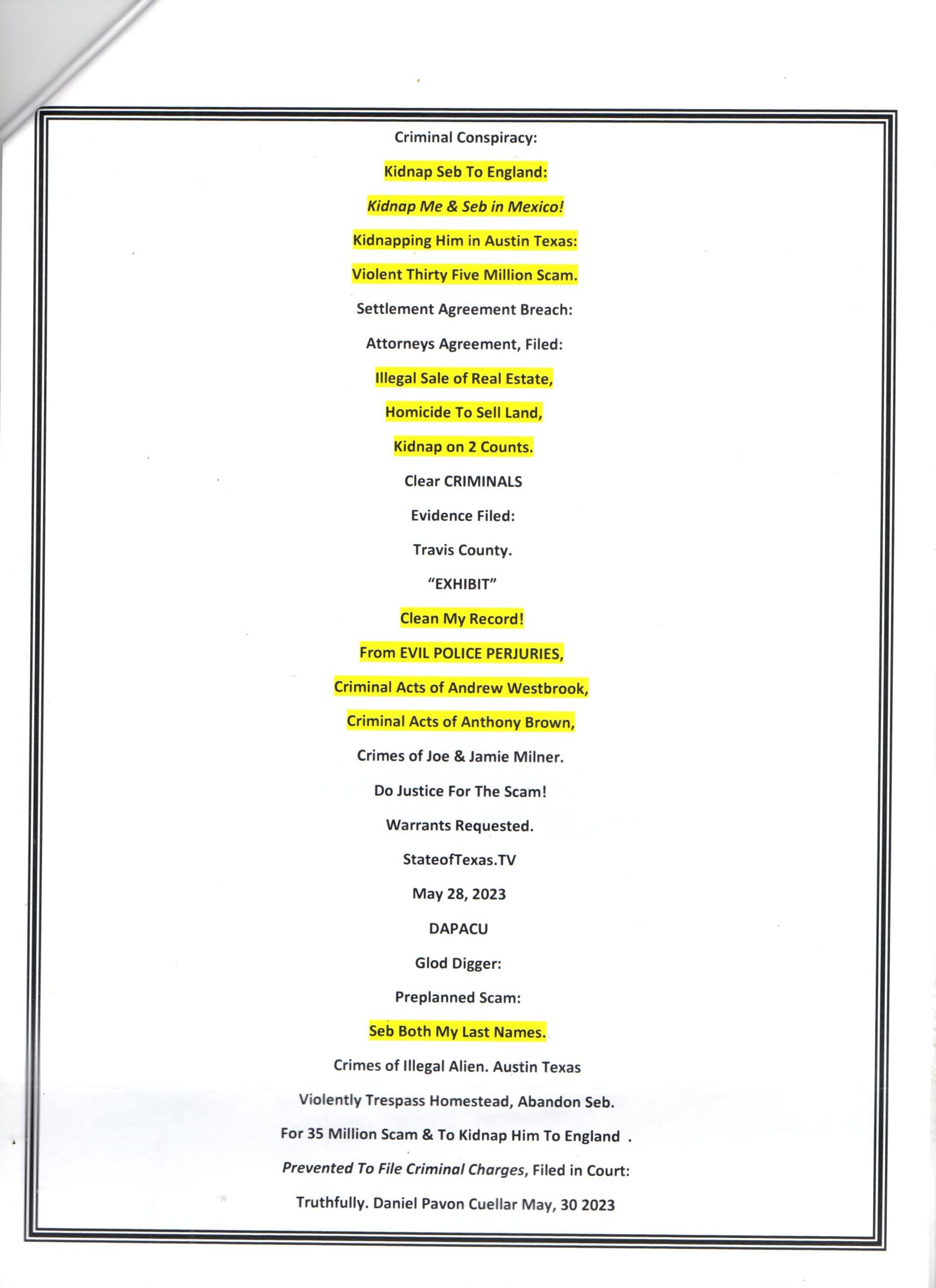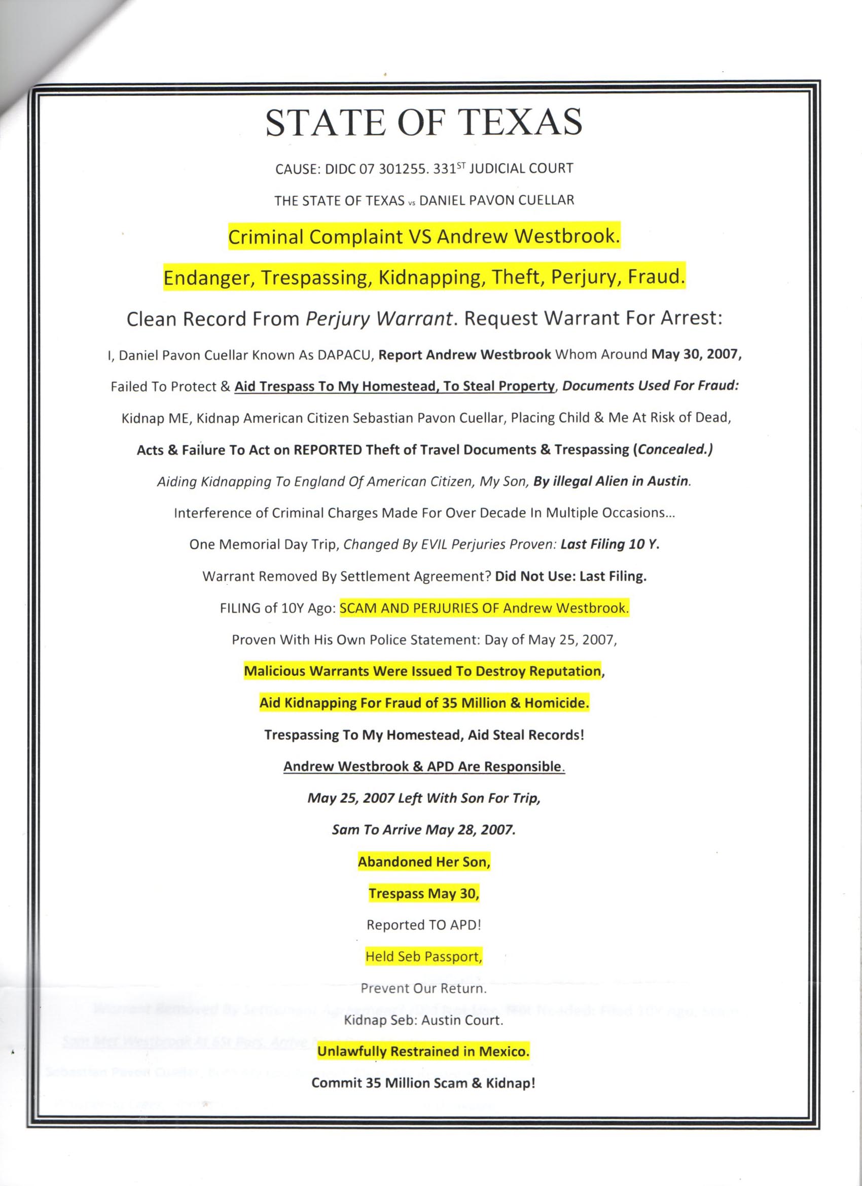 Austin Police Department Trespassing, Kidnapping, Homicide... WARRANT FOR ARREST VS ANDREW WESTBROOK Following Records Sent For Filing in State Of Texas Criminal Court. Sent To The Prosecutors Who Prosecuted Me, To Prosecute Andrew Westbrook! Somehow, This Record Ended on A "Dismissed Case" in Travis County Court! Now Prosecuting The Prosecutor Who Prosecuted Me For Not Prosecuting! Forbidden To Press Charges For Endless Crimes Committed Against US! For A Fraud of 35 Million Dolars, in Austin Texas By THE US MAFIA