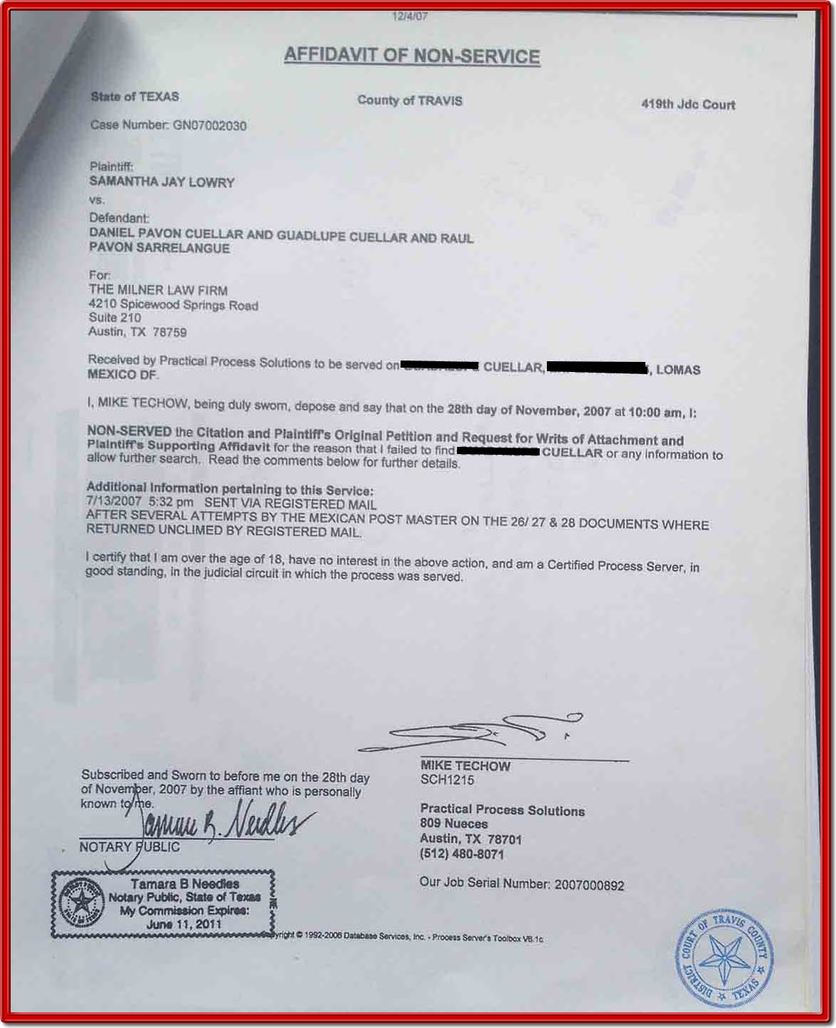 NON SERVICE AFFIDAVIT, No Zip Code,